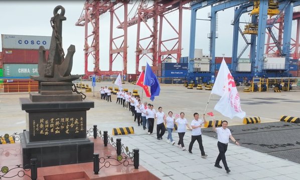 校旗从欧亚大陆桥出发,先后飘扬在港口控股集团大厦、新东方集装箱码头、国际货柜码头、新亚欧大陆桥桥头堡、中哈国际物流公司,最终抵达中哈物流展厅。这场传旗之旅,宛若一次深情的巡礼,跨越了河海人奋斗的每一个闪光坐标。