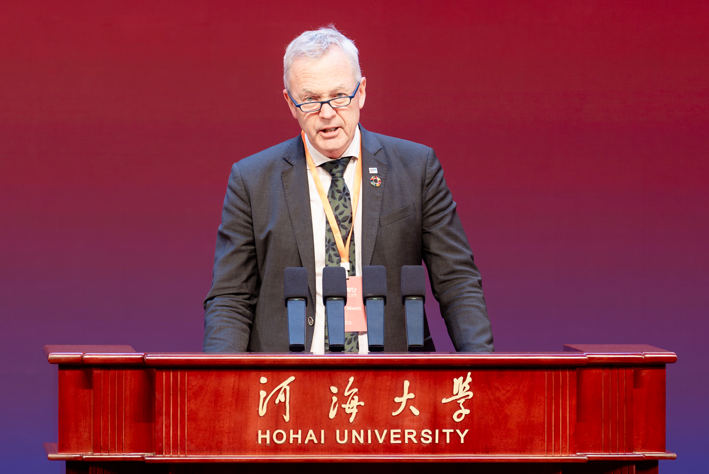代尔夫特水教育学院校长Eddy•Moors作为国外高校代表致辞。他表示,河海大学作为中国最早专注于水利领域的高等学府之一,为中国江河湖泊与河口三角洲可持续发展作出深远贡献,有力推动全球水科学进步。荷兰与中国同为依水而生的国度,正因都秉持着团结合作精神,河海大学与荷兰高校之间的合作,得以跨越时光、结出硕果。在共庆河海大学百十辉煌成就之际,希望两校携手持续推动水科学创新发展,培育未来水利领域的领军人才,共建一个更具韧性、可持续发展的地球家园。